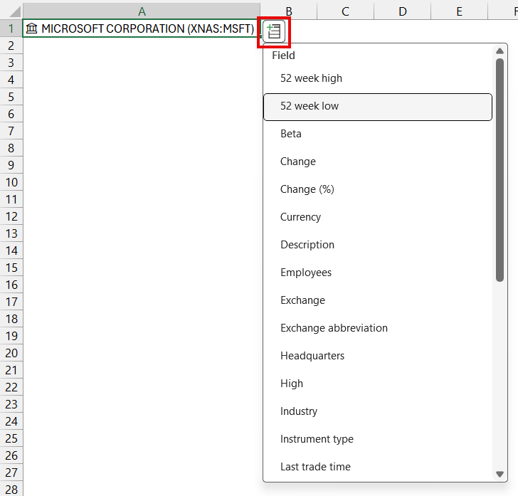 After the cell has been turned into a stock data-type a small icon appears which allows adding columns with information about the stock: