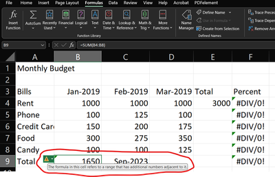 Priyanshu1325 It's not an error. Excel merely alerts you to the fact that you perhaps missed some cells in the formula. The header row shows "Jan-2019" but probably is a real date, hence a number. The formula sums B4 to B8 and Excel's background error checking thinks that you perhaps also want to include the number from B3. Obviously not, so you can ignore the alert.