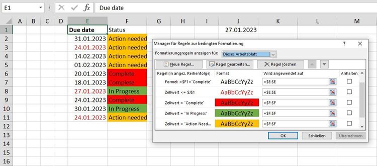 I have a date column in which the date is manually entered. It is currently formatted to turn the text red if equal to or past the due date. This same spreadsheet also has a status column which contains a data validated list of statuses.