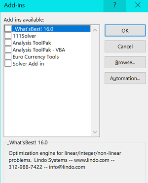 Hi. In the past I used Lindo, Whatsbest and Solver (and VBA too) in my excel. about a year ago, my VBA stopped working and I think I tried to re-install it but it never worked and my Solver, Whatsb...