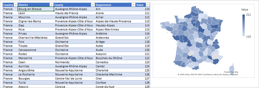 It very depends on how you organize the data and name the columns. I'm not familiar with the geography of French, sorry, took departments from here https://en.wikipedia.org/wiki/Departments_of_France