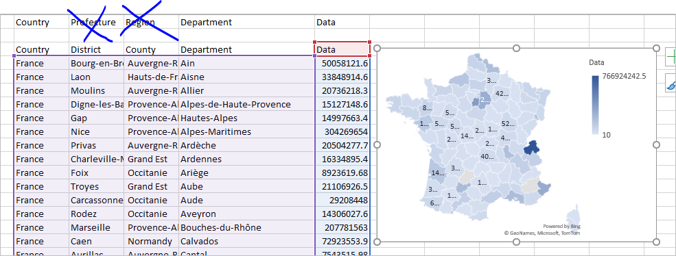 J'essaie de faire des cartes chloroplèthes (2D, pas 3D) des régions et départements français dans Excel 365. Pour les régions ça marche mais pas pour les départements car Excel ne reconnaît pas les noms des départements. Comment dois-je procéder?
