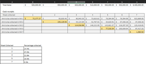 For each week I have total sales. I am trying to figure how much I can expect to collect each week. For example, the cells in yellow are indicating to me in which week to expect to collect the totals sales from week number 1, $500,000