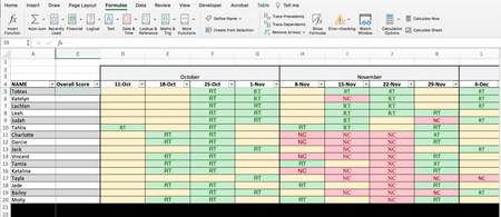 Hi, Fairly new to using excel formulas and could use a hand i am trying to Display a value ("C" or "NC") in cell C5 based on the percentage of "RT" or "NC" from cells D5-K5. Yellow(blank) cells a...