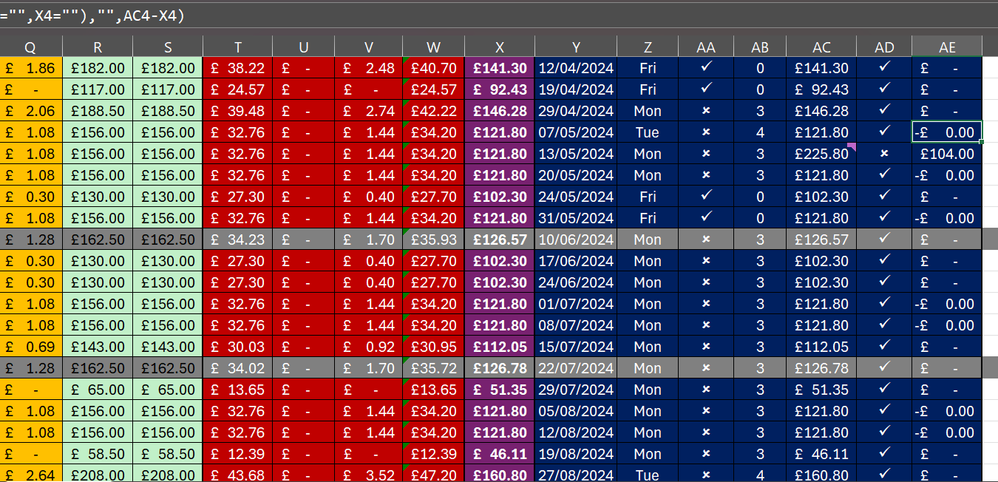 My formula is =IF(OR(AC4="",X4=""),"",AC4-X4) on the selected cell. But you can see there are 5 negative values and are all £121.80 in AC.