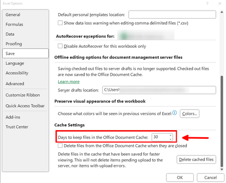 Change Cache Settings Days to infinite or unlimited for Excel files