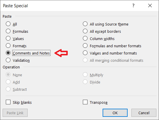 notisaconed Probably the easiest way to transfer Comments and Notes from cell to cell is to use Copy / Paste Special > Comments and Notes. First, select the cell with the note you want to transfer and press Ctrl+C to copy it. Next, select the destination cell and press Ctrl+Alt+V to open the Paste Special dialog box (or go to Home > Paste > Paste Special on the Ribbon), then press C to select "Comments and Notes" and press Enter (or select it with the mouse and click OK).