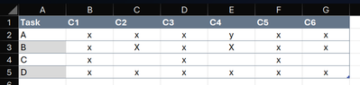 I need to change the color on Column A based on Columns B-G having the same value of "x" in them. I have been trying different formulas and nothing is working for me. Thanks in advance for your help....