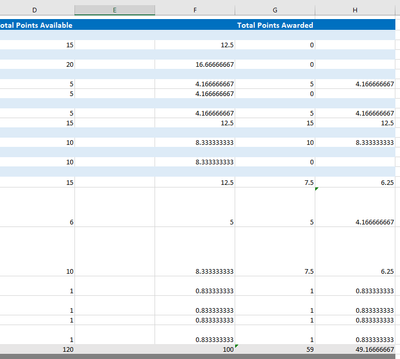 JKPieterse The project below was scored on 120 points. I need to convert 59/120 to a 100 point scale. Some projects were scored out of 95 points, etc. I'm thinking a data table would do this for me (I did the below conversion manually) but haven't figured it out yet. Thank you for any assistance you can provide!