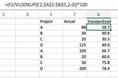 =(F2/VLOOKUP(E2,$A$2:$B$5,2,0))*100