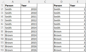 Hello! I have a data set like the one in the screenshot on the left side and want to convert it to the version on the right side. With the following logic: The first appearance of a person/year c...