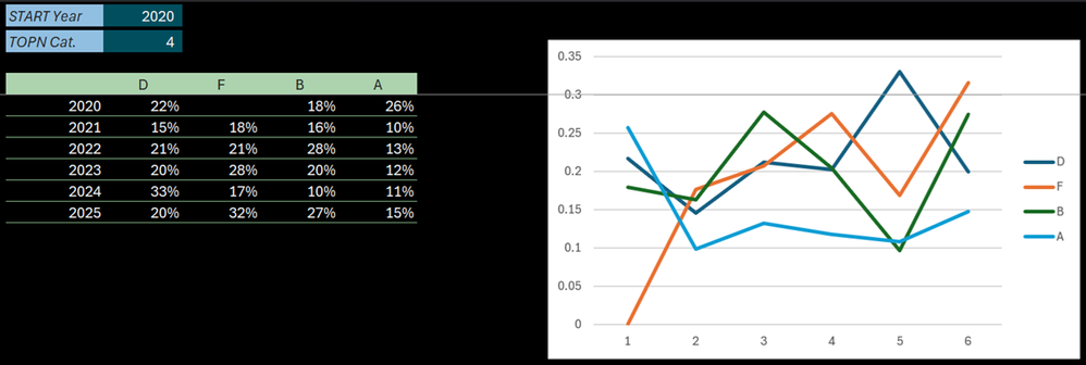 The below chart data range is a dynamic array (could be wrong for the desired chart) - named GRAPH_Series on sheet GRAPH_Ranges - similar to the array on the left side of the pic. The arrays dynamically resize according to the 'START Year' & 'TOPN Cat' variables - so far so good