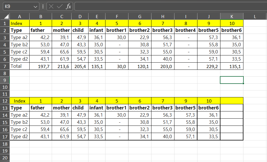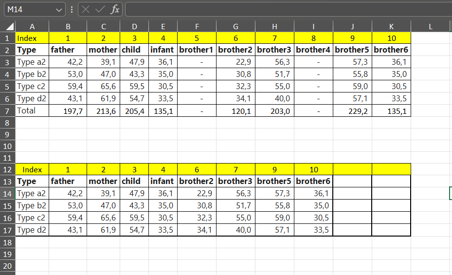 The problem here (if I understand it correctly!) is that the series of the chart are the family members, so the number of series varies. In the example, the series for brother1 and brother4 should be removed.