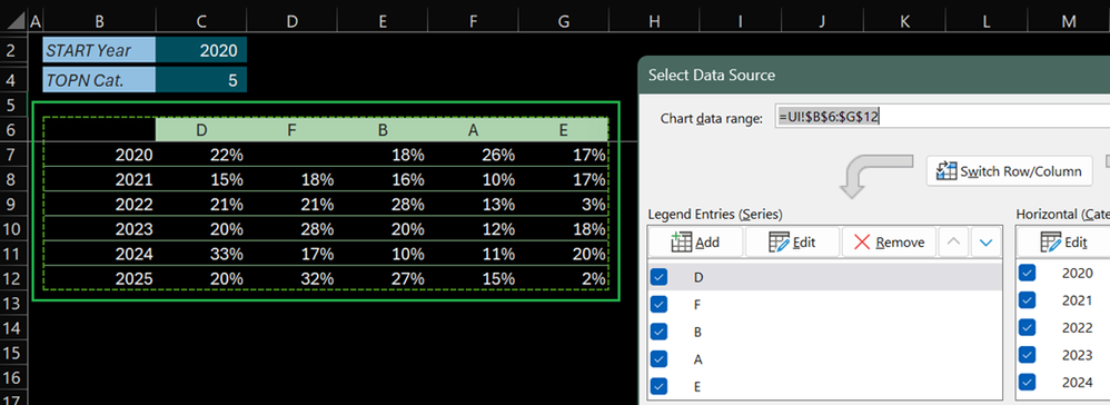 Edit Horizontal Axis Labels: =UI!$B$7:$B$12- Set TOPN: 3 // Result: 4 series (1st blank) + No Year on xAxis...