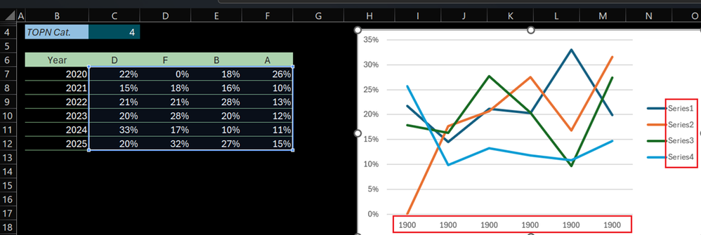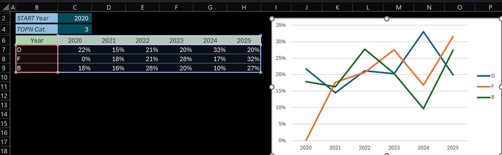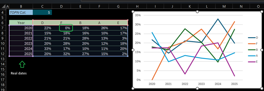 =HSTACK(VSTACK("Year",BYROW(TAKE(TOPN_Pivoted,-6,1),LAMBDA(y,DATE(y,1,1)))),DROP(TOPN_Pivoted,,1))Create a chart from that array and it will come out like this: