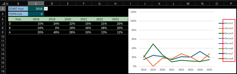 In B6 below an array that dynamically resizes according to the 'START Year' & 'TOPN Cat' variables. The Chart is setup as follow: