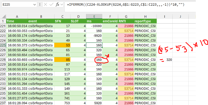 Now , consider row number 207, for the rnti-53714, the ms(in column E) should be 885(row-207) - 855(row204) corresponding to that rnti.. while in