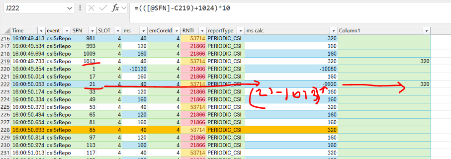 It has 2 rnti's( 2,18,66 and 53714), and in column "E" , is the time-difference between two consecutive SFNs, for the corresponding RNTIs.