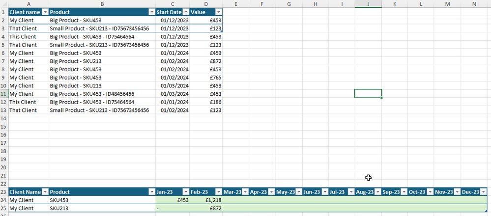 Does that make sense? The upshot being that the green cells below show the total of that given clients spend on that specified SKU for that period.