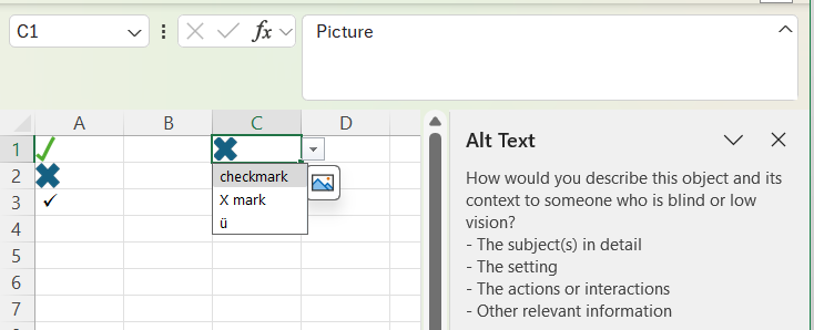 I want to have the check and cross symbol appear in the drop down list. I have created two cells, one with the check symbol (Wingdings font) and cross symbol (Wingdings font). When are create the drop down list the symbols appear as "ü" and "û". is there a way to have the list show the symbols?