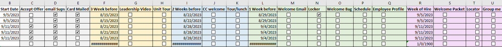 I want the cell with the checkbox to be colored based on checked or unchecked and based off of the date that it corresponds to i.e., G2 is unchecked and F2 is a past date so G2:G6 and H2:H6 should all be red. If the date is within one week of being due and the boxes aren't checked I want the checkbox cells to be yellow i.e., J4:J6 and K4:K6 should all be yellow. If the checkboxes are completed for a section the checkbox cells should be green i.e., C4:C5, D4:D5, and E4:E5 should be green.