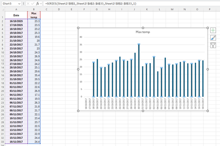 Hi everyone, I'm at my wit's end with this very simple graph. I'm trying to create a chart showing maximum temperatures for each day between two dates. The data appears to show as part of the range...
