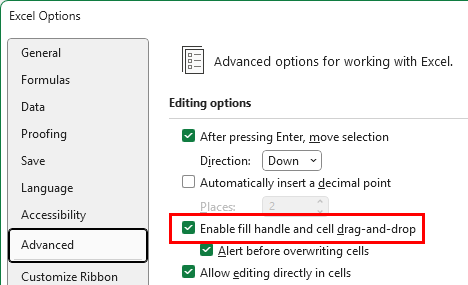 Make sure that the check box "Enable fill handle and cell drag-and-drop" is ticked.