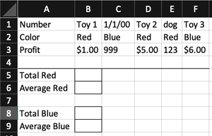 I have 100 toys, and I would like to get the total profit for each color of toy, and the average profit. 1 column for each toy, 100 columns. In between each toy column will be random various text, in...