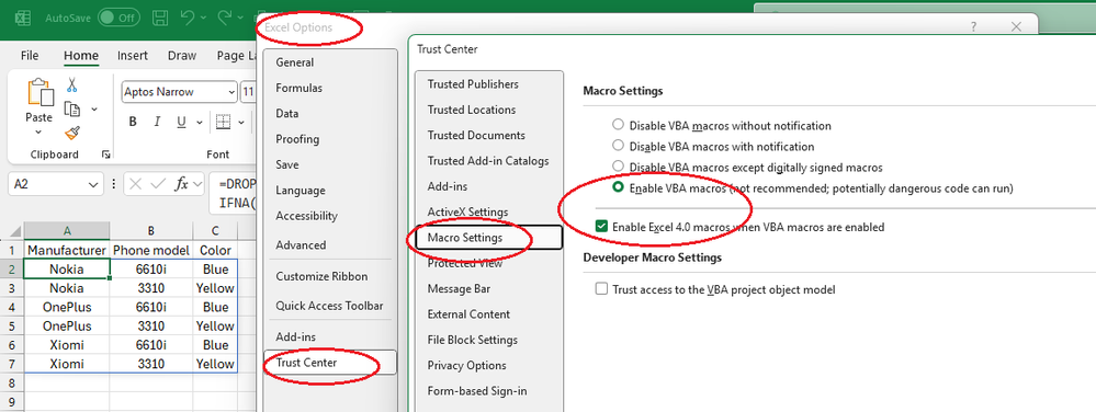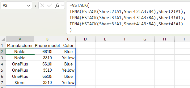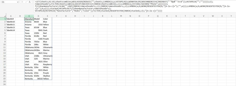 =LET(sheets,A1:A5, sheetscombine,DROP(REDUCE("",sheets,LAMBDA(x,y, VSTACK(x,IFERROR(TRIMRANGE(INDIRECT("'"&y&"'!A:B")),HSTACK("",""))))),1), removeheaders,FILTER(sheetscombine,NOT(BYROW(INDEX(sheetscombine,,1),LAMBDA(x,ISNUMBER(SEARCH("Phone",x)))))), filldownmanufacturer,SCAN("",MAP(INDEX(removeheaders,,1),INDEX(removeheaders,,2), LAMBDA(a,b,IF(REGEXTEST(b,"[A-Za-z]+"),"",a))),LAMBDA(a,b,IF(REGEXTEST(b,"[A-Za-z]+"),b,a))), stacked,HSTACK(filldownmanufacturer,removeheaders), VSTACK( HSTACK("Manufacturer","Model","Color"), FILTER(stacked,REGEXTEST(INDEX(stacked,,3),"[A-Za-z]+"))))I understand you only want basic functions but just in case you want to log on to your Microsoft account and use all the latest functions in Excel online you can use this formula. Or perhaps other users want to try this formula which handles multiple tables in some sheets and no table in some sheets.