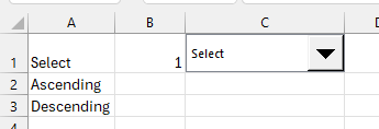 I used =if(b2=”Select”,c1=”Ascending”,c1=”Descending”) and then added a helper row below to filter out the 1 to use in my next formula. Thanks for your help.