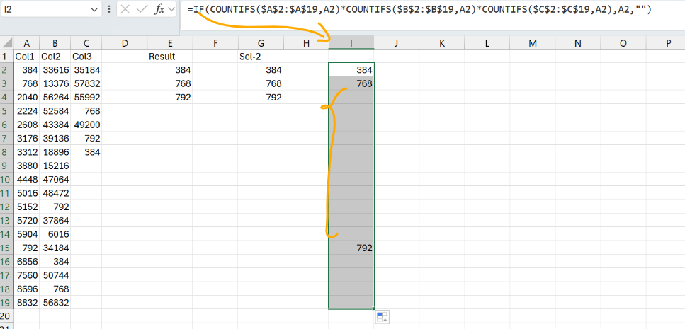 Dear Experts,                       I have a data like below, in Col-A/B/C and in Col-E , I want the common rnti's from A&B&C Col, Thanks in Advance, Br, Anupam