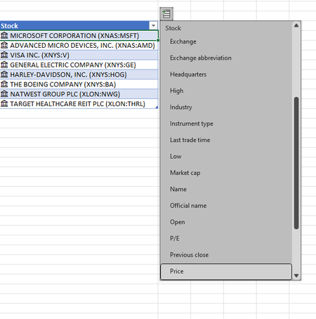 I want to create a list of stocks and some details on them that update automatically. I've found help how to do this and have created a table with a list of company stocks using the Stock button, all...