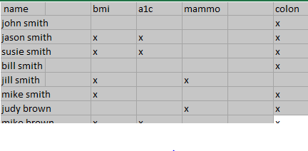 I receive a file each month with a list of patients and what preventative services are due. I change the cell color of the x cells to green when I have completed them. next month I will...