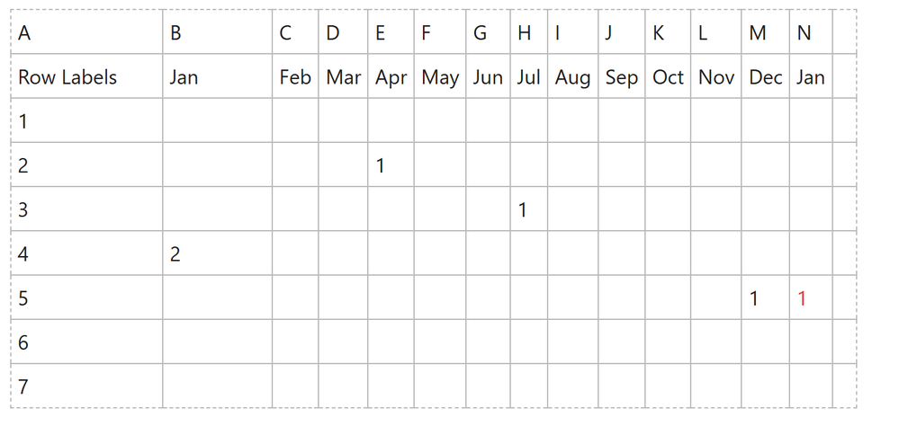Your current formula works in the worksheet because it checks cells to the left but will not work in the Data Model or Power Pivot. To count only the first occurrence per row by month, unpivot your months in Power Query and add a calculated column: FirstMonth = CALCULATE(MIN(Table[Month]), ALLEXCEPT(Table, Table[RowID])) CountFlag = IF(Table[Month] = Table[FirstMonth], Table[Value], 0) This counts only the first occurrence. Worksheet formulas still work but will slow performance on large datasets.