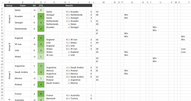 I'm building a spreadsheet to track and bracket the World Cup. Anyone familiar with the rules knows that there are multiple logical criteria for determining who progresses. Reference this screengrab:
