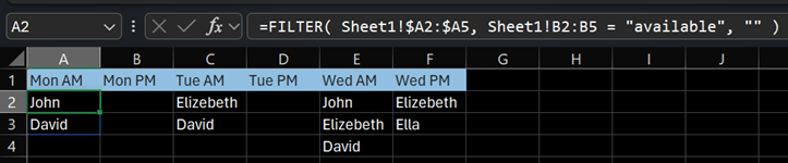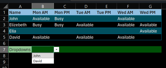 I have a table with everyone's availability. Column A is names, Column B is Monday morning, Column C is Monday afternoon and so on. In another cell, I want a drop down list of names if they're available at that time. If( [Monday Morning] = "Available") put it in the drop down list and then do that for the whole week. When I try to do formulas in the data validation page it doesn't work.