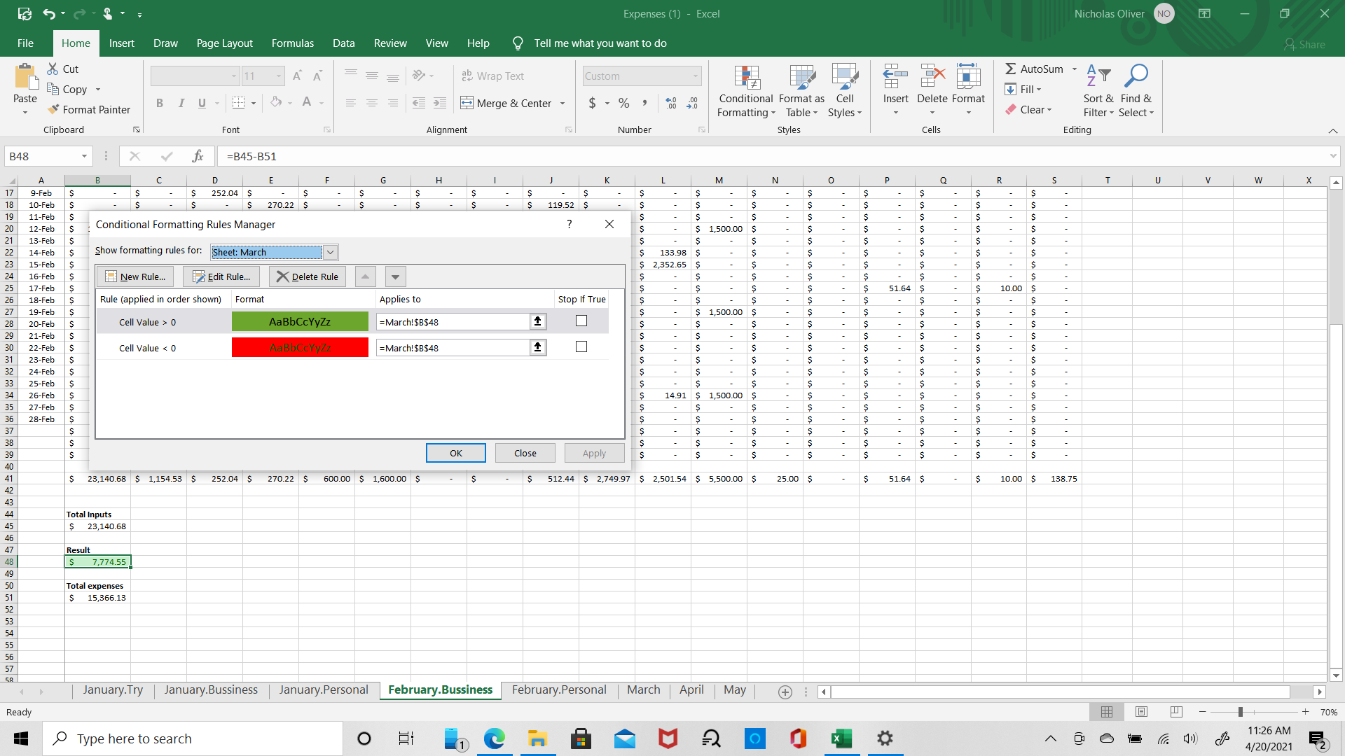 I attached the picture showing the conditional that I put in but it says March and the sheet is February because I am stock there and I don't know how to apply it to the same cell.