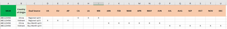 There should be a corresponding X in each Region per SKU.