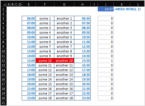 I'm making a bi-hourly schedule, it consists of 4 columns E:H and 18 rows from 6 am to 11 pm. In the E column, I have the hours (10:00, 11:00,...) and in the H column, I have the half hours (10:30, 11:30,...). Now I would like the cells in columns F and G to check if it's the current hour and to highlight when it is so.