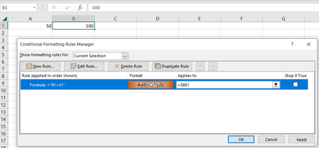 Now, the selected cells will change their color based on whether their values are greater than the specified adjacent cell's value.