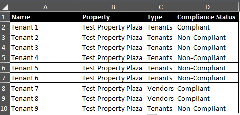 I am putting together a report for my supervisor regarding our tenant and vendors insurance requirement compliance status. He wants me to pull the data from the website monthly and highlight all of the non-compliant vendors so that the property managers can clearly see who they need to reach out to.