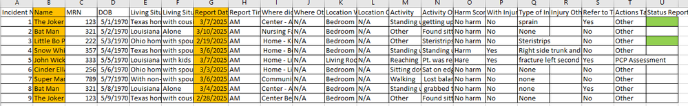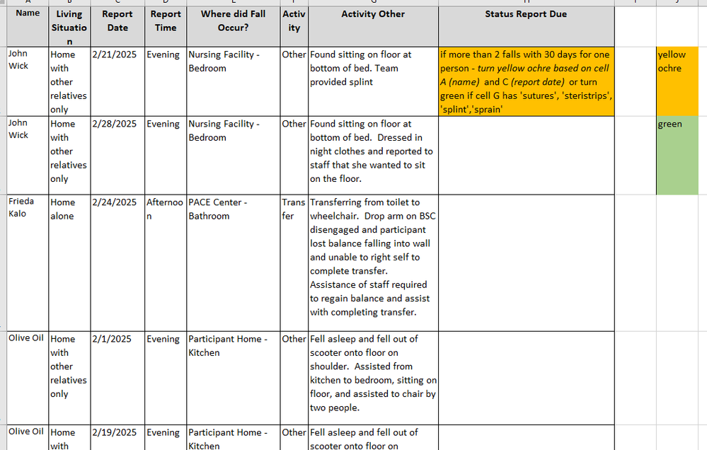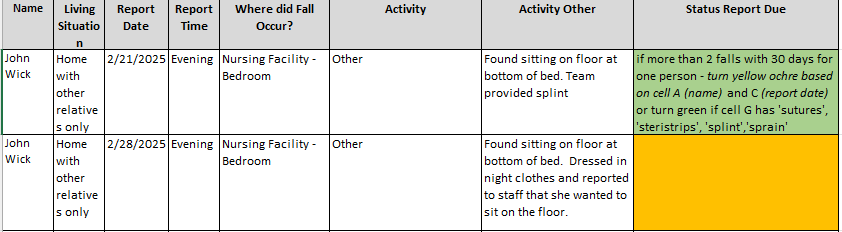 Need to create a new rule that changes cell colors (column H) based on more than 2 falls (column C) in 30 days for the same person (column A). I've found the formula for just the date - but not for adding in the same name. Goal is to be alerted (visual alert) if someone fell more than 2 times in 30 days. Thanks!