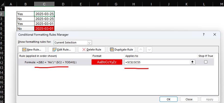 I'm trying to add conditional formatting in to a spreadsheet that when a cell contains "No" and the date in a different cell has passed; it highlights the date cell in red. But only if the first cell contains "No",