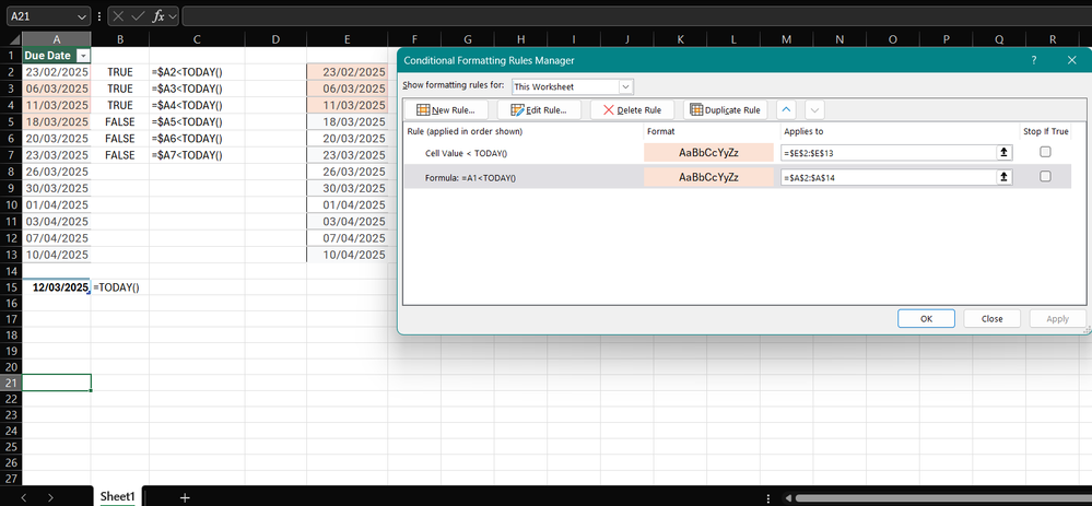 =A2<TODAY()This rule returns the intended result. The rule must reference the leftmost cell of the first row of the applies to range. Since applies to =$A$2:$A$14 the rule must reference A2. For example if the applies to range is $D$7:$H$25 we would have to reference cell D7 in the rule for conditional formatting.