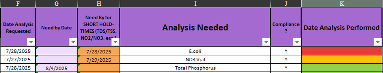 I have 4 Columns that are linked, one has Analytes listed, there is not a set list of analytes or some kind of drop down because some are new and one time use. Two columns change the date shown based on the analytes listed in the first column and a base requested date, one is date + 5 which is a general due date, the other is a fast turn around time due date that changes the addition of days based on the original analyte listed. I need a fourth column to now change based on todays date or tomorrows date and whether the column has been filled in, denoting the analysis has been completed. There is a column for the day it was requested that these formulas use as the base date.