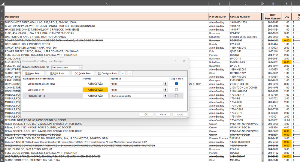 I'm trying to format columns A, B, and C based on whether the value in column F is equal to 0. The conditional formatting rules shown result in rows doing just that (although only sometimes) but ...
