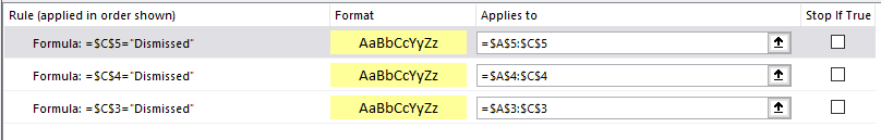 What I need to accomplish: If "Dismissed" is selected in Column C I need it to turn Cells A,B, & C in that row Yellow but only that row. Above is the only way I can think to do it but then I would have to basically copy and change the row # from Cell 3 to 3003 and boy I'd really like to avoid having to spend the time doing that. I'm sure there is a way to do this in a much simpler faster way, I just can't think of how to get it done other than the way I don't want to do it.