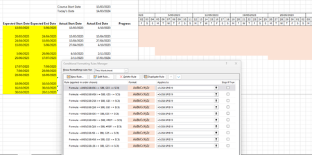I am trying to work out how fix the end date of my conditional formatting. The start dates are fine, but the end dates haven't registered. I have highlighted the dates I am currently using, and the c...