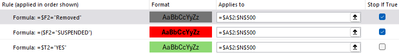 The final screenshot is what I am trying to achieve, but this rule is only applicable to Row 1 alone and when I try to apply it through to Rows 2-100, it greys everything out regardless.