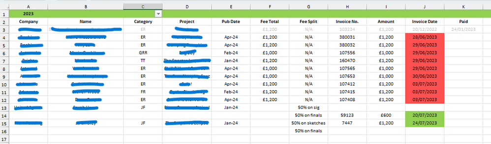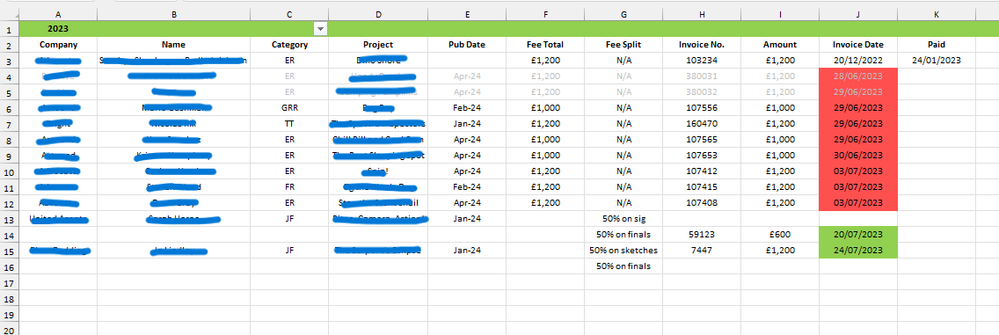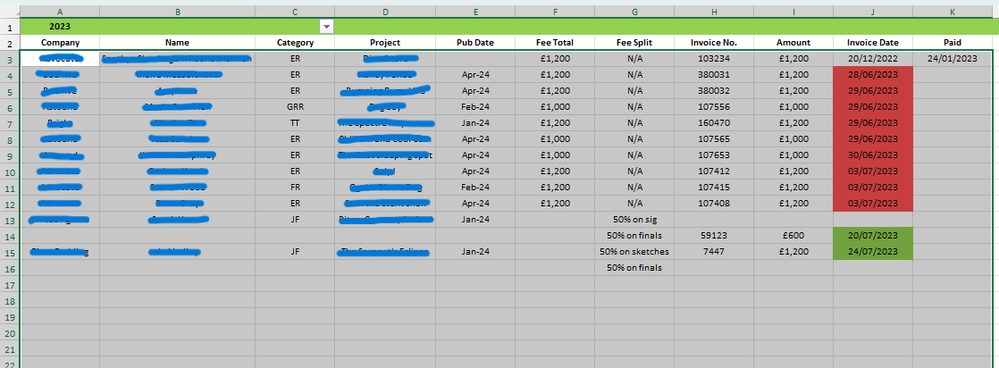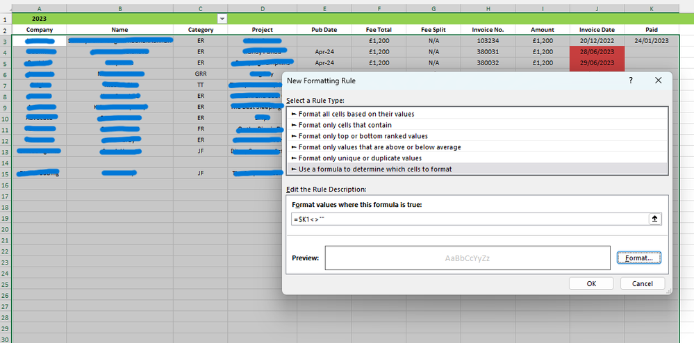 I'm hoping this is the right thread to ask this question, but I am looking for a way to conditional format each row individually dependent on whether or not there is a value in a single cell corresponding to its individual row. I.e. All of the row 1 is greyed out because K1 contains a date, but if K2 doesn't contain a date then row 2 is not greyed out.
